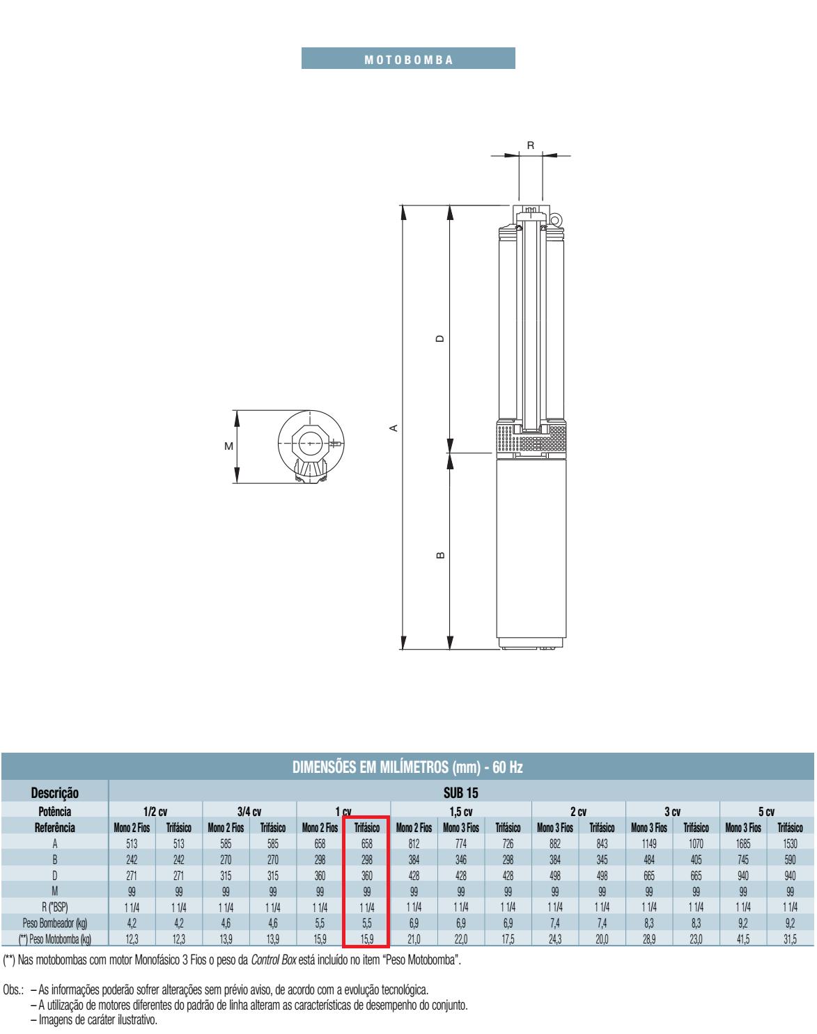 Motobomba Submersa 4″ SUB15­10NY4E8, 1cv, Trifásico, 230V