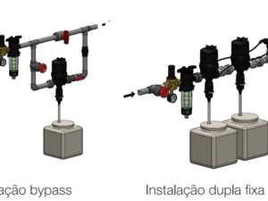 Os dosadores MiniDos são instalados diretamente na linha de água e funcionam sem eletricidade. A água movimenta o motor hidráulico que, por sua vez, movimenta o sistema de injeção na parte inferior do equipamento.