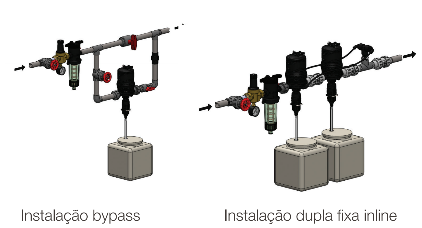 Utilizando apenas a pressão e vazão do sistema como força motriz, a dosagem é proporcional ao volume de água que flui na linha.
